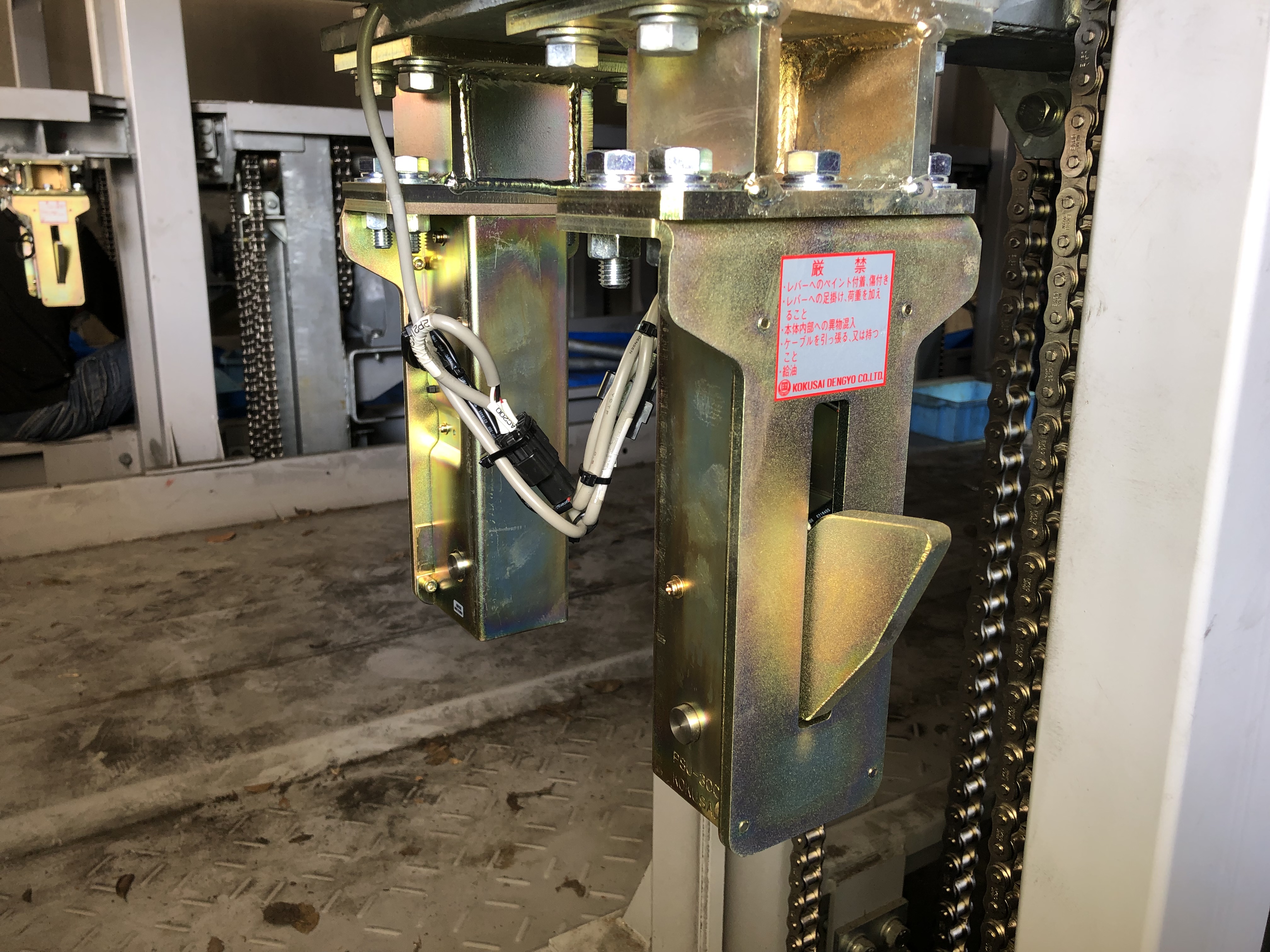 落下防止装置とは、入庫している車やパレットの落下を防ぎ、人や車を守るための安全装置です。物理的にパレットをロックする機構や、センサーで車の位置を監視するシステムによって、万が一チェーンやモーターブレーキが破損するなどの異常が発生した場合には、自動的に装置が作動するようになっています。