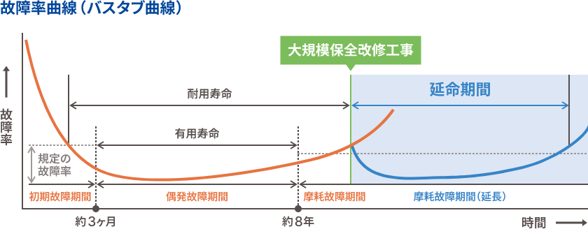 「バスタブ曲線(故障率曲線)」を知る事により、保全政工事の有効性が明らかになります。